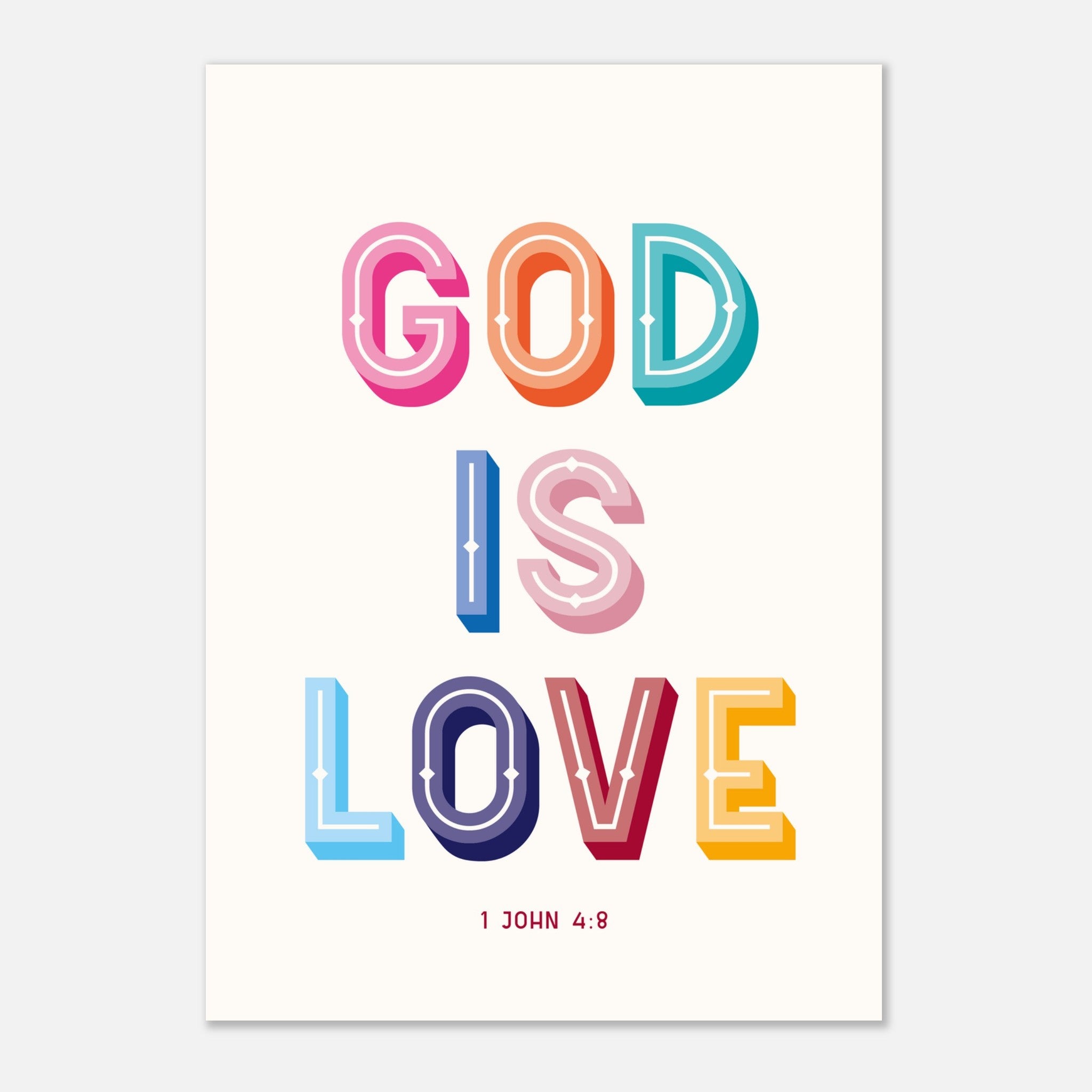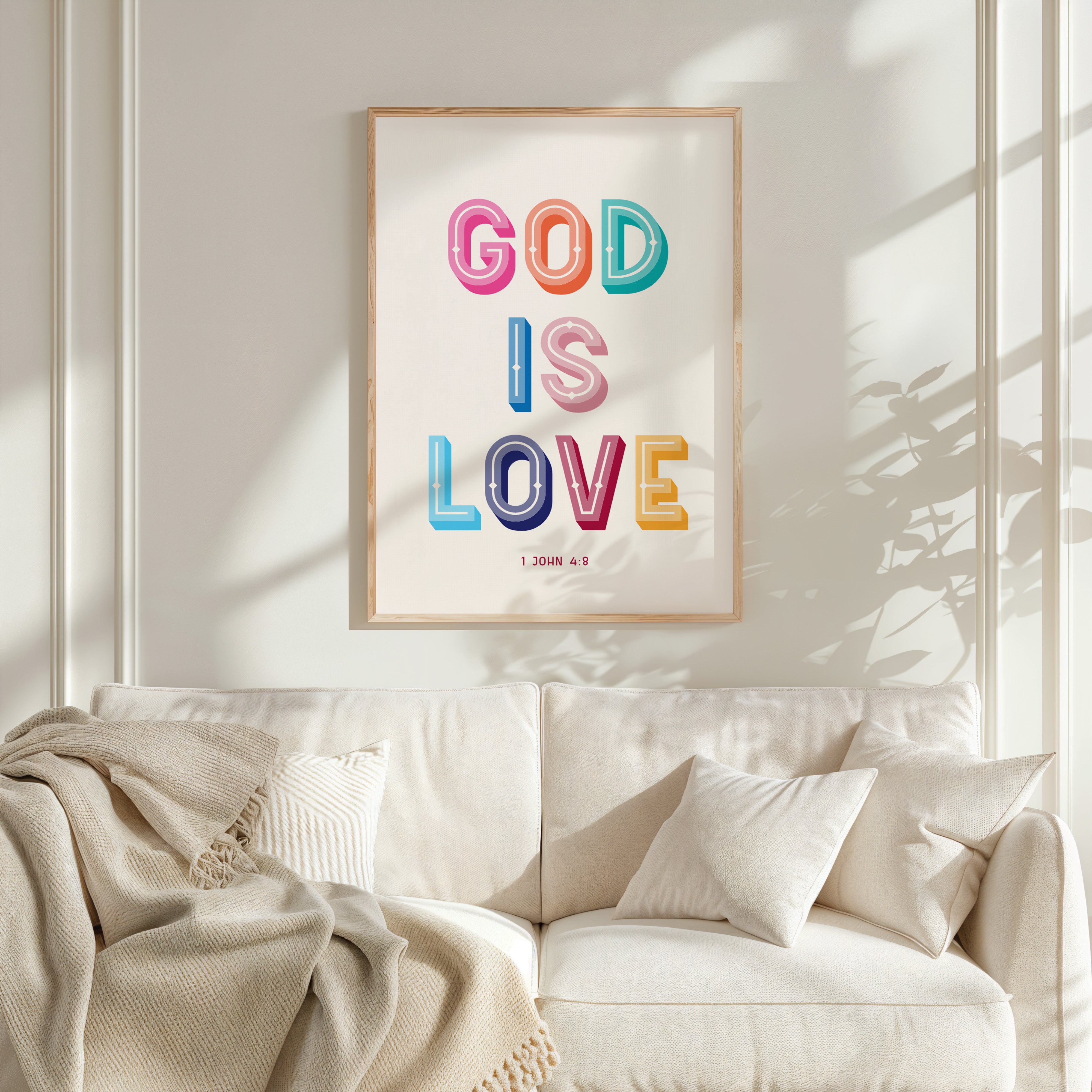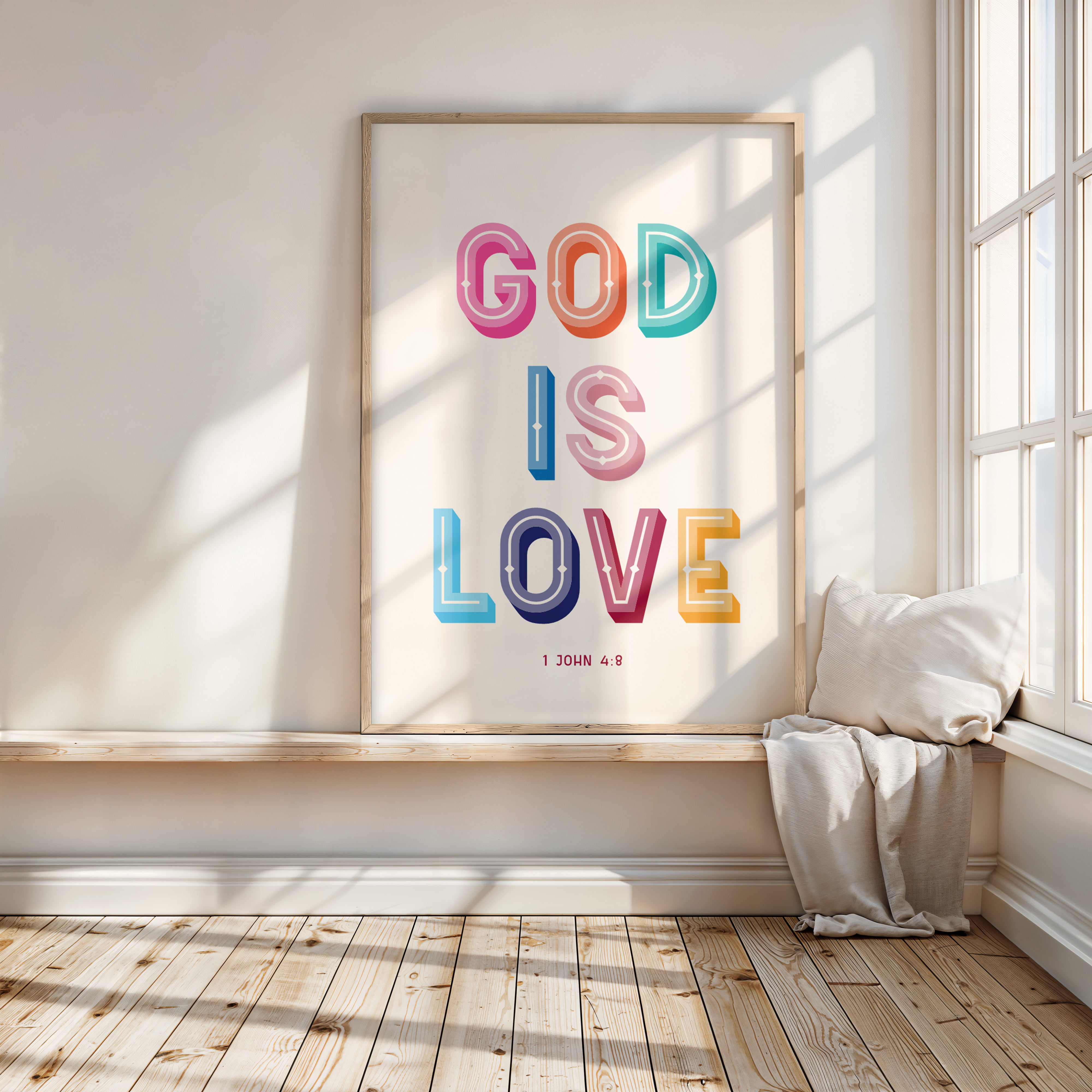 Loud, joyful, and bursting with colour—this bold “GOD IS LOVE” art print is pure happiness! A playful reminder from 1 John 4:8 that love is at the heart of everything. Perfect for brightening walls and lifting spirits.