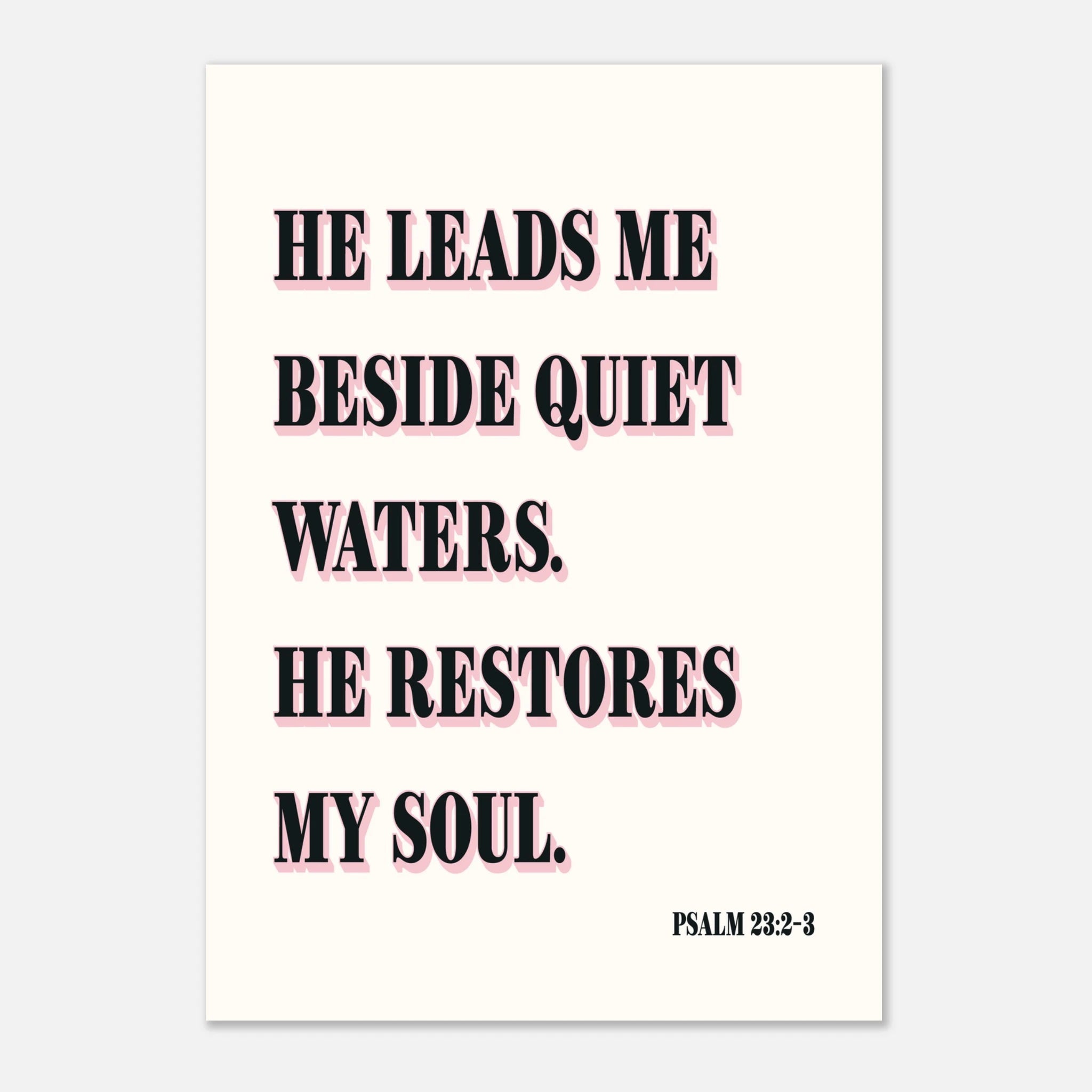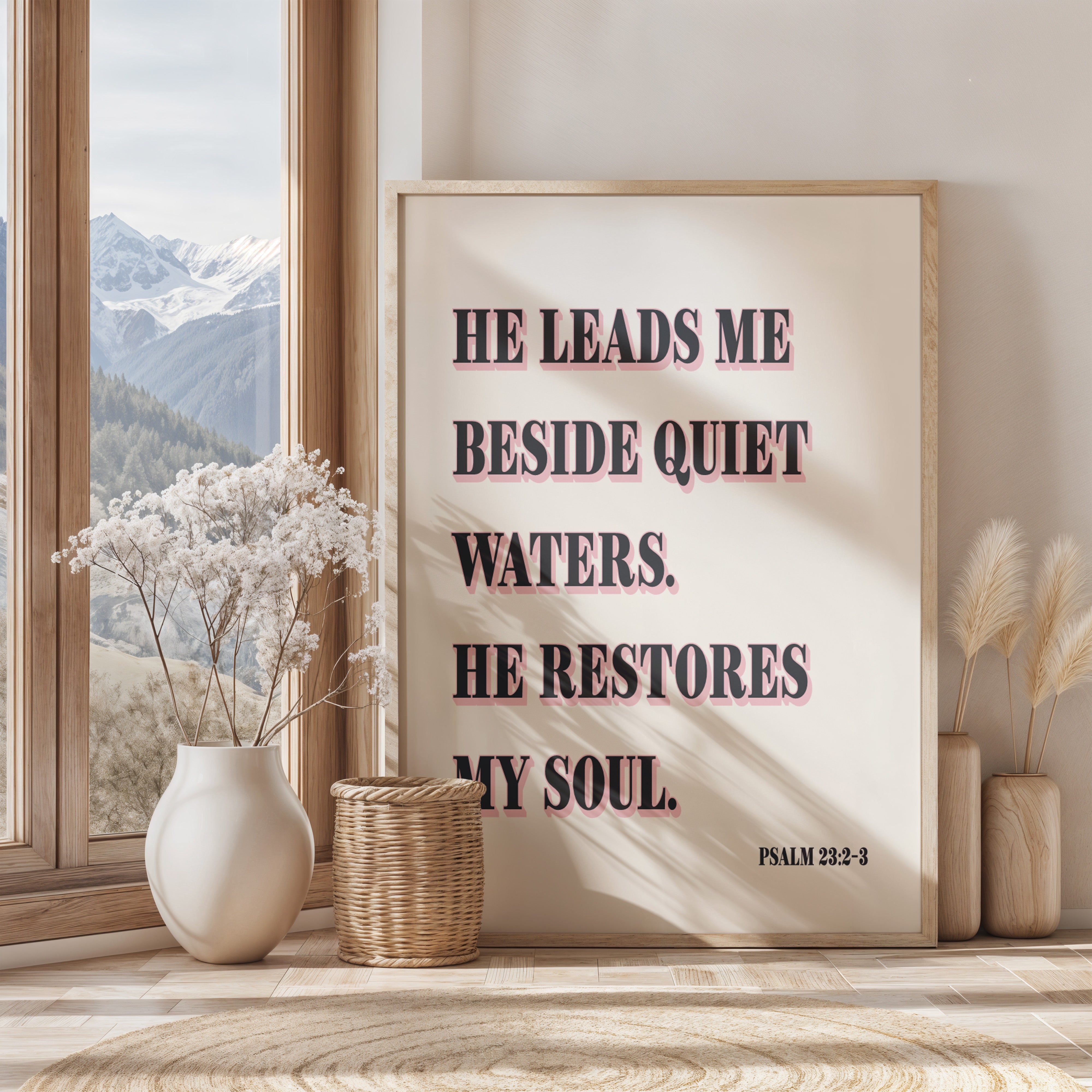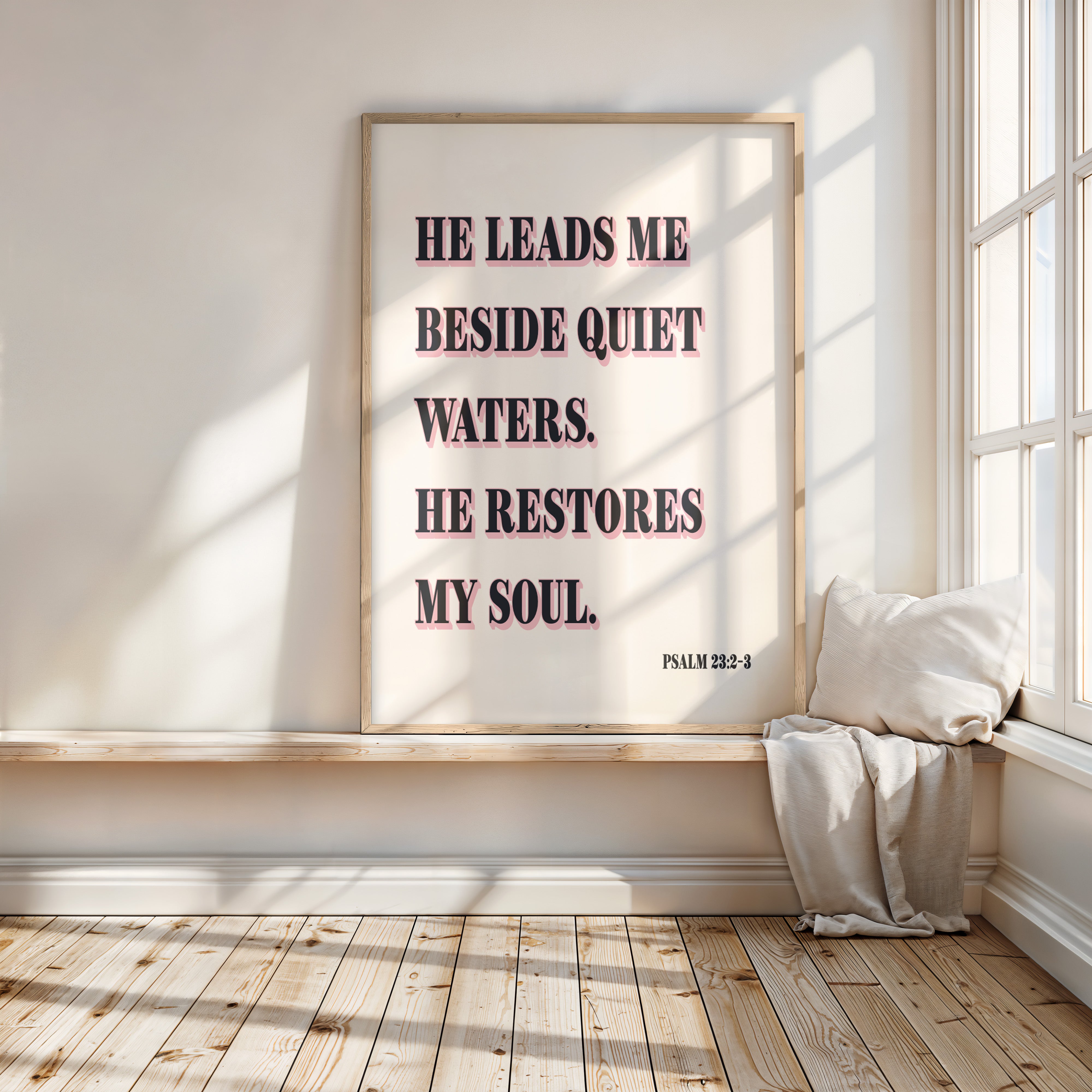 Find rest and renewal with this calming Bible art print inspired by Psalm 23:2-3 – "He leads me beside quiet waters, He restores my soul."