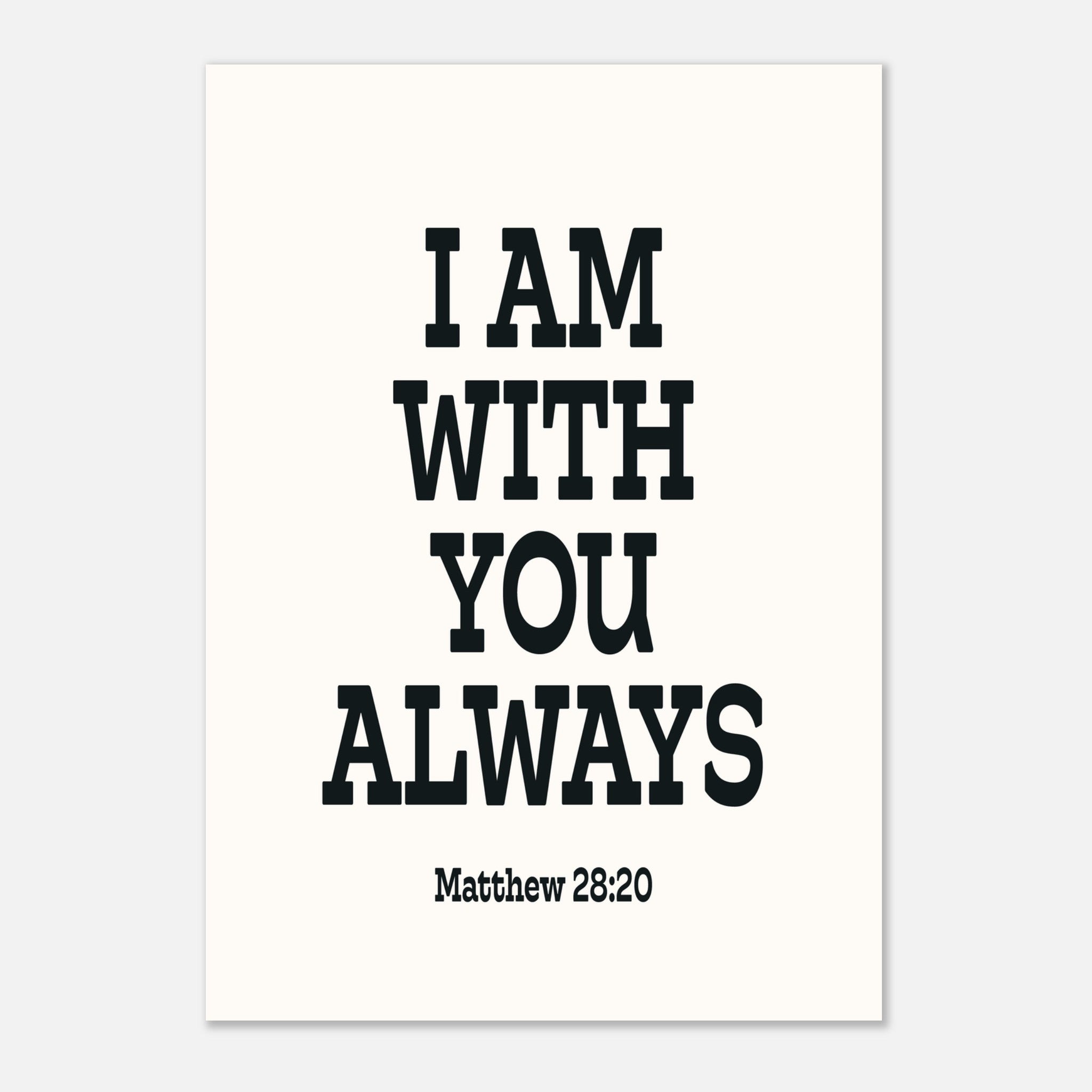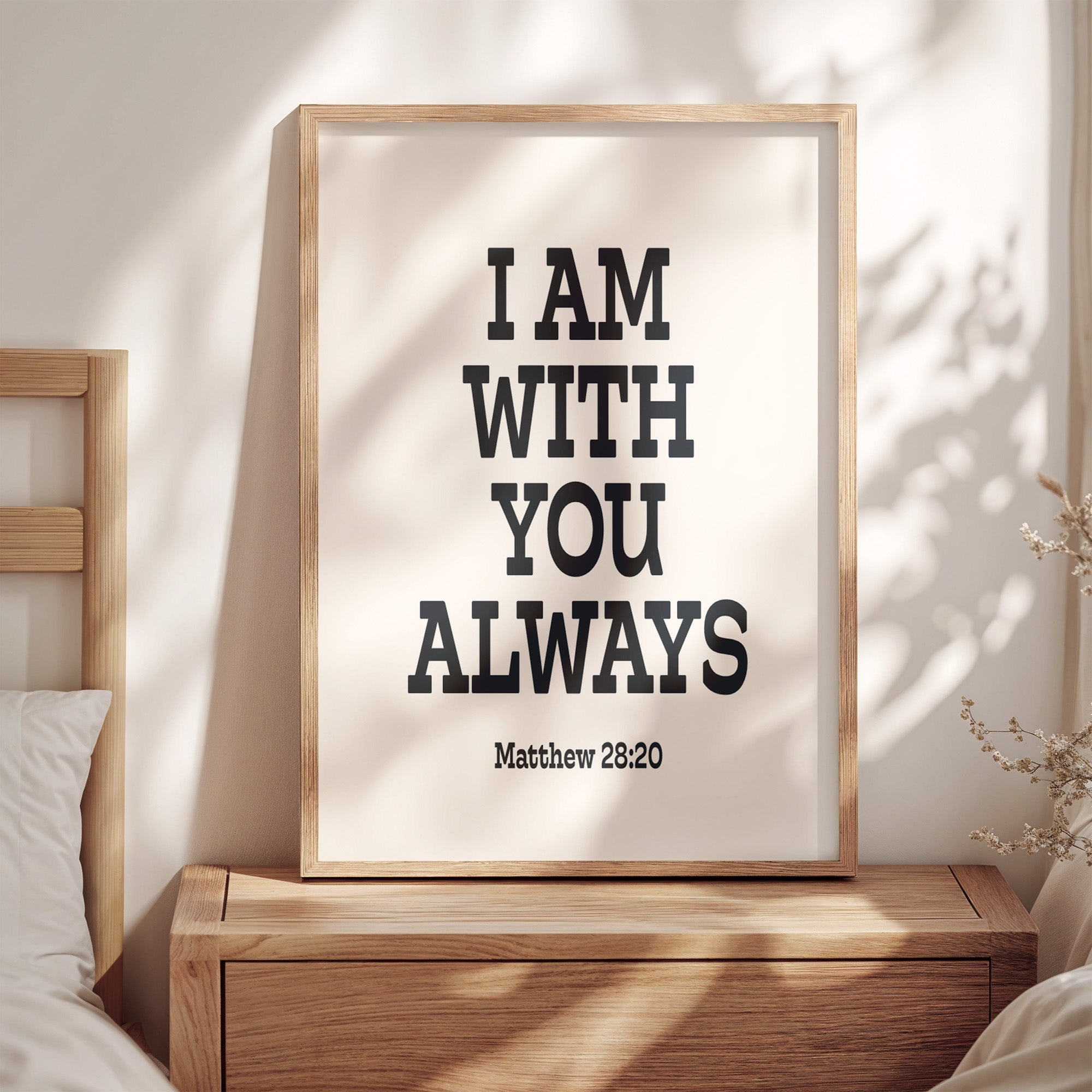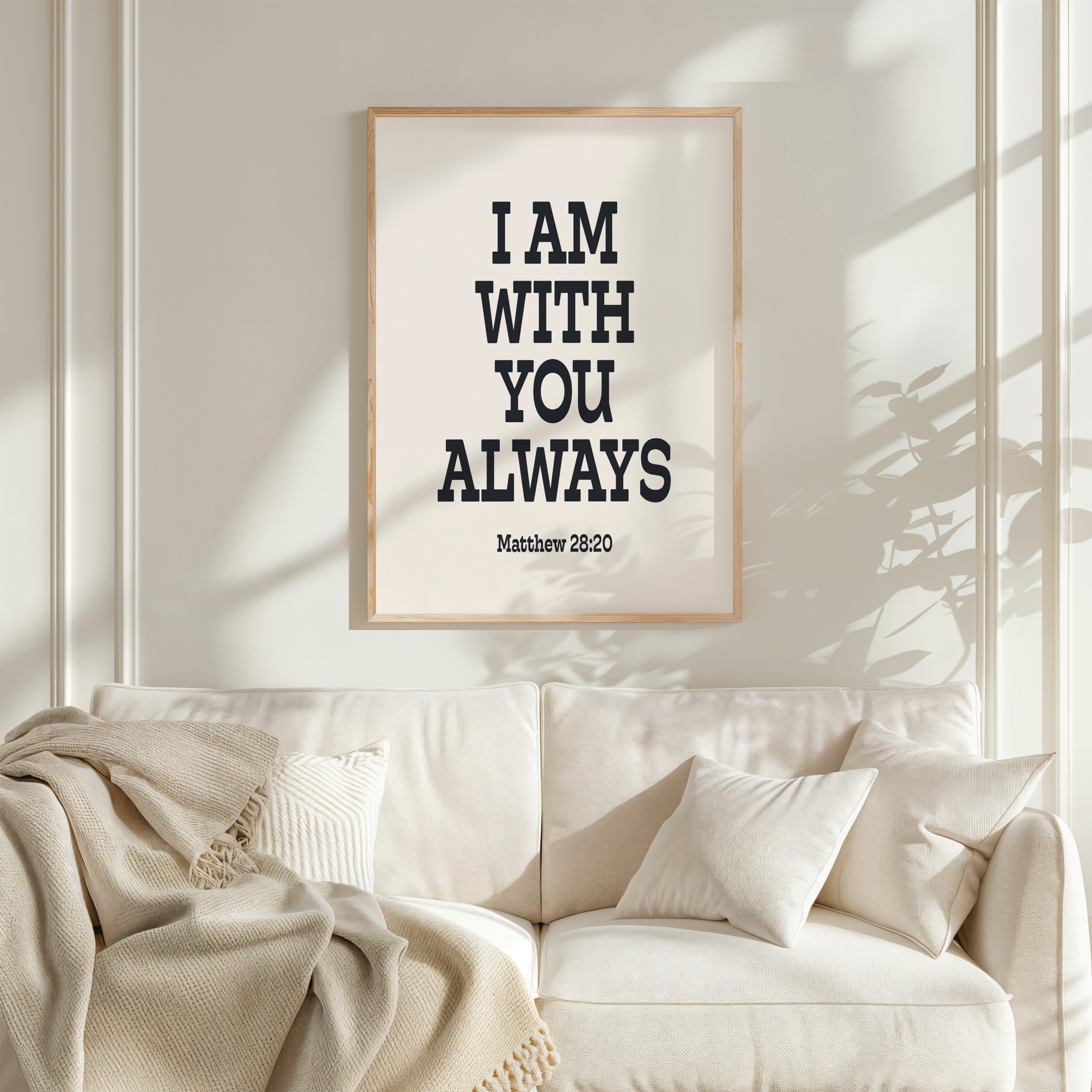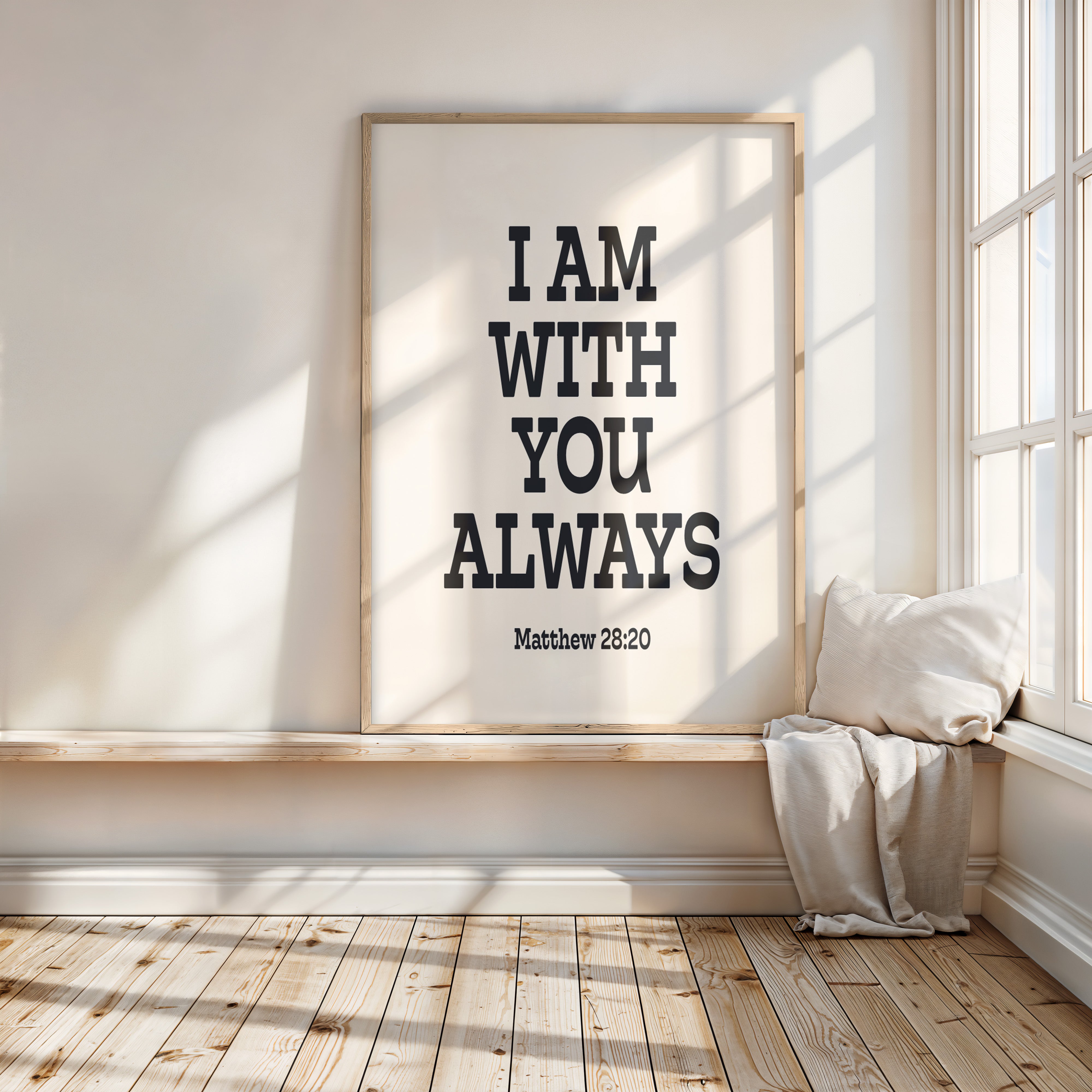 Featuring the powerful words "I AM WITH YOU ALWAYS" (Matthew 28:20), this inspirational art print is a timeless reminder of God’s unwavering presence.. A beautiful way to anchor faith and hope in any home.